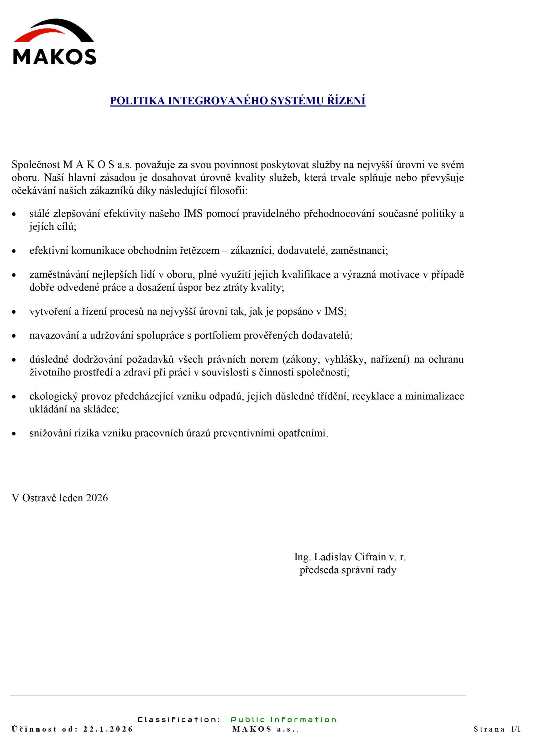 Politika integrovaného systému řízení společnosti MAKOS a.s. se zaměřuje na poskytování kvalitních služeb, neustálé zlepšování procesů, dodržování legislativních požadavků, ochranu životního prostředí a bezpečnost práce.